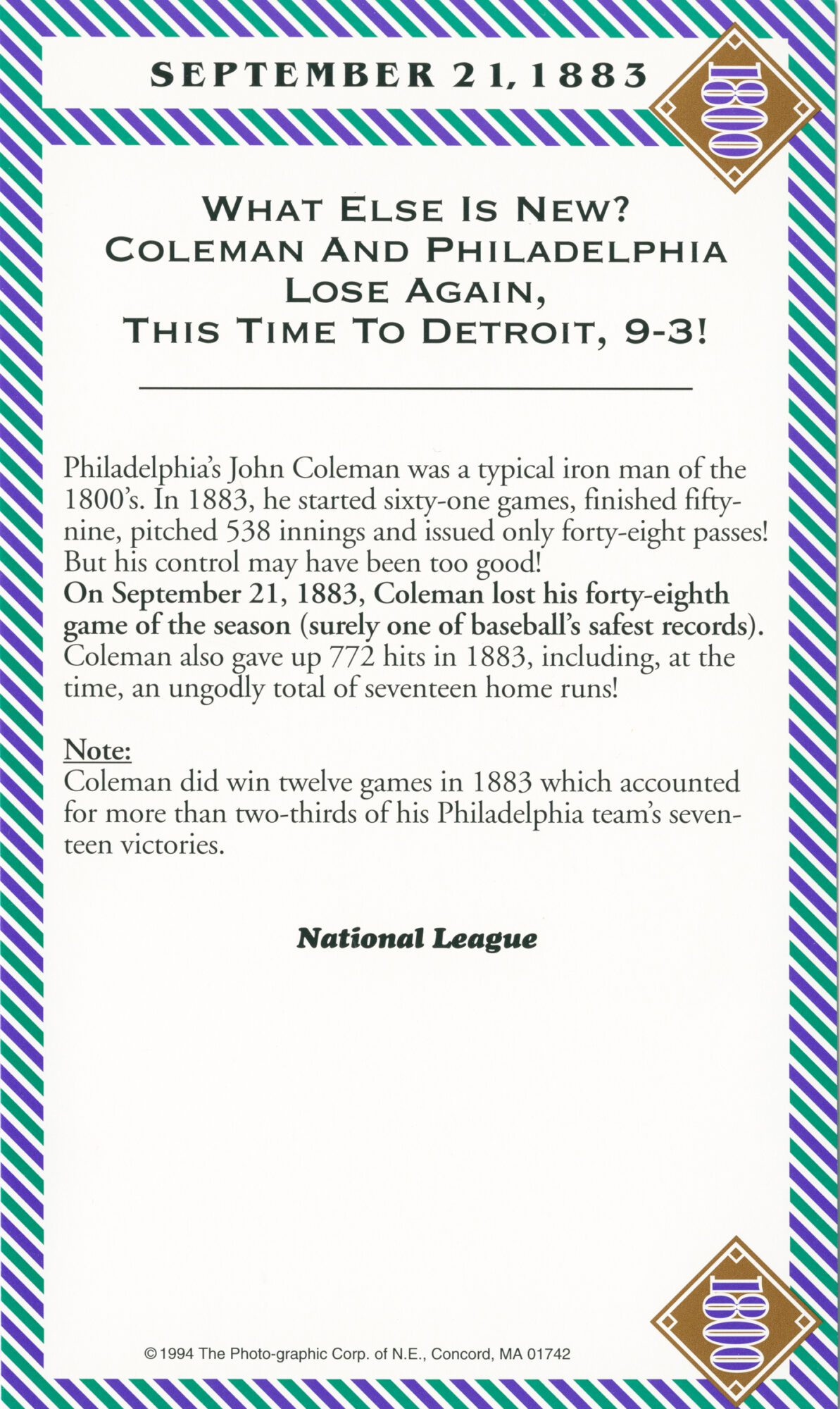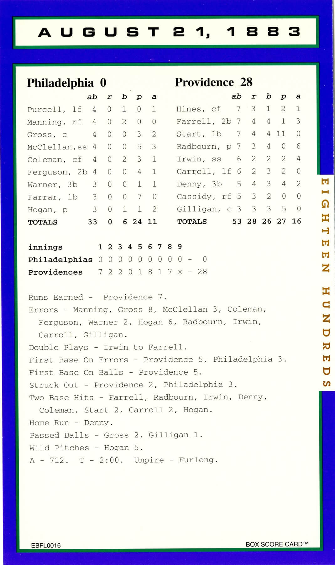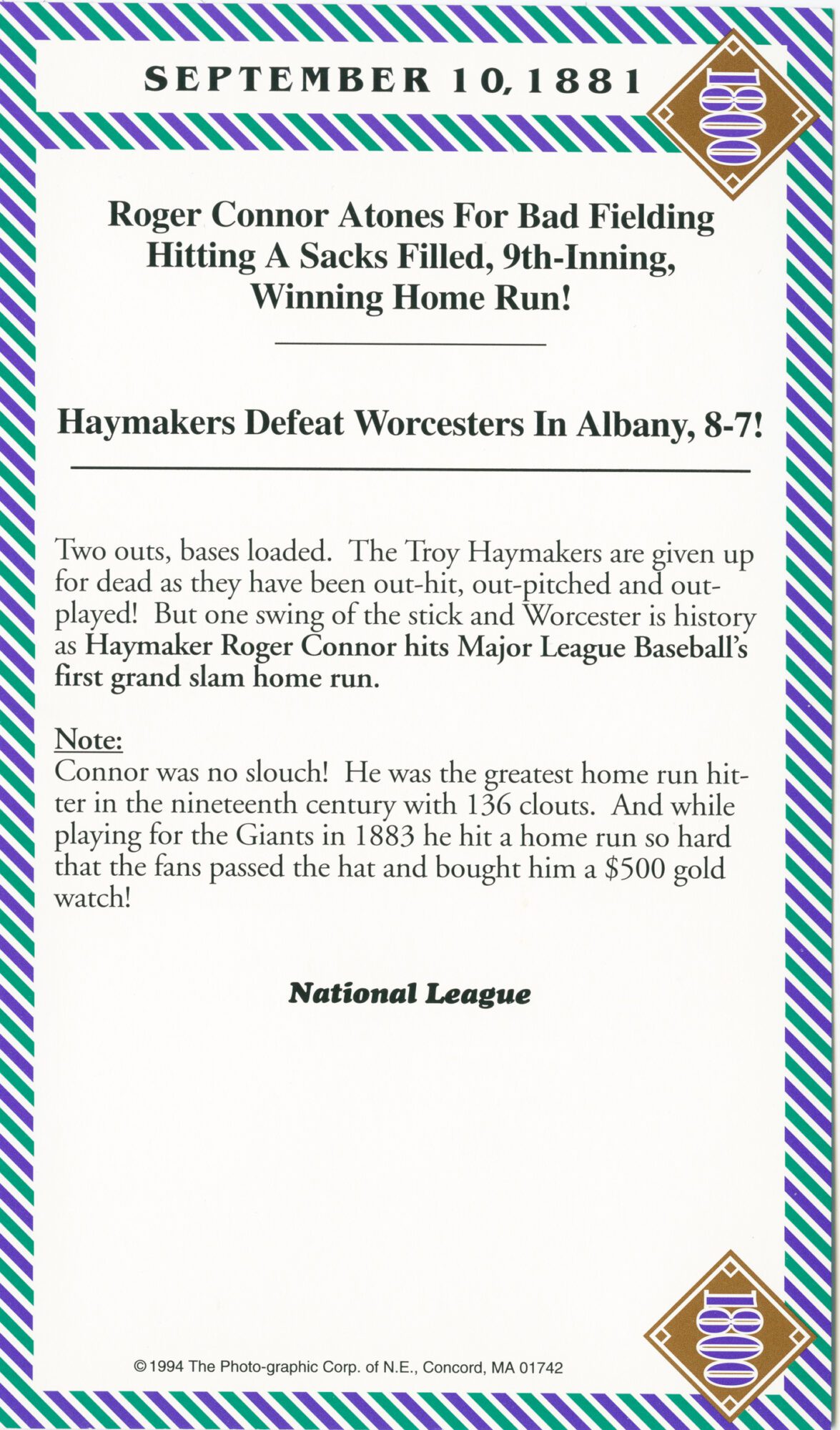 Important Note: These 1800s box score game cards are part of our original box score set, a rare collectible. And, since the set was published in 1993 a few additional facts have surfaced. One such example: It had always been believed that ‘Old Hoss’ Radbourn had 60 wins in the 1884 season. However, after publishing the set, it was discovered (with the explosion of information & technology) that in fact ‘Old Hoss’ had only 59 wins for the ’84 season. 59, 60 … Regardless, ‘Old Hoss’ had quite a year, including winning all three games of baseball’s first postseason championship.
