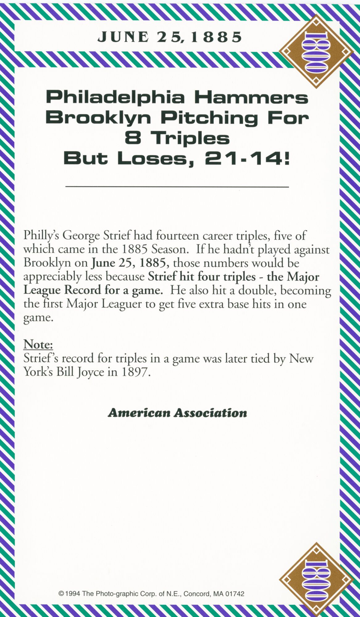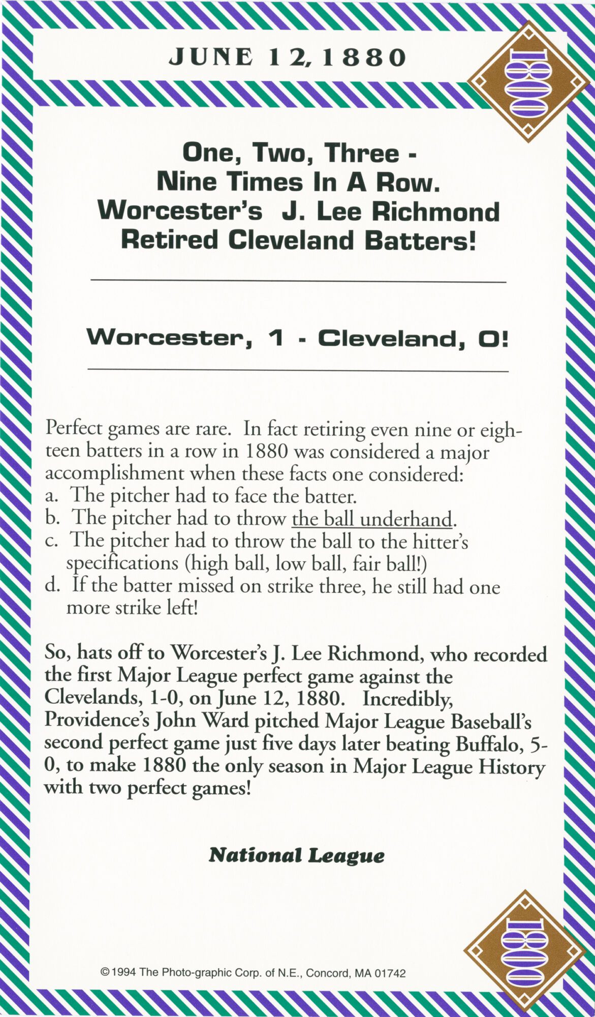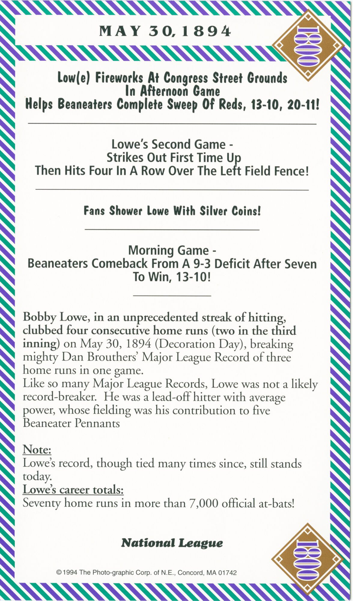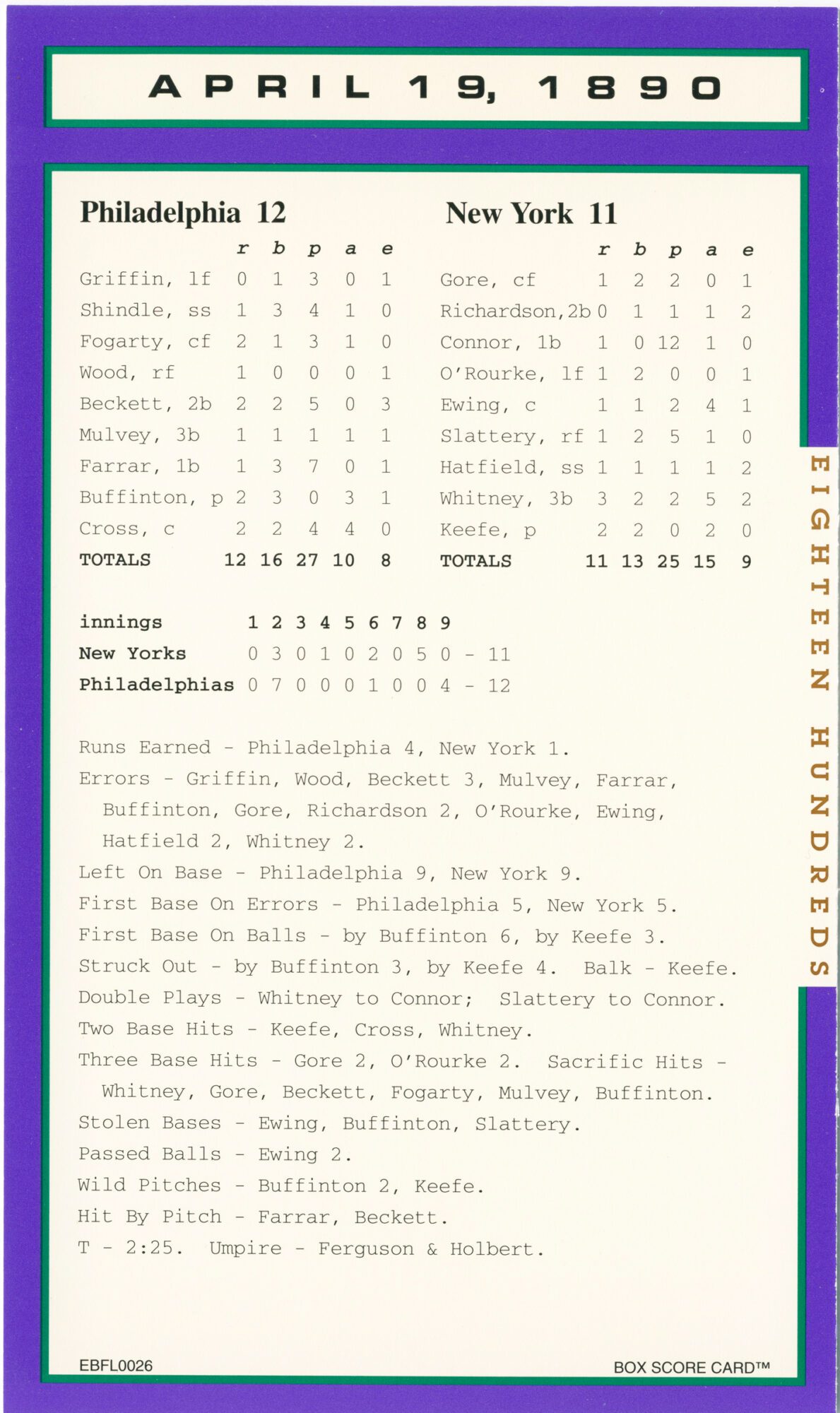 Important Note: These 1800s box score game cards are part of our original box score set, a rare collectible. And, since the set was published in 1993 a few additional facts have surfaced. One such example: It had always been believed that ‘Old Hoss’ Radbourn had 60 wins in the 1884 season. However, after publishing the set, it was discovered (with the explosion of information & technology) that in fact ‘Old Hoss’ had only 59 wins for the ’84 season. 59, 60 … Regardless, ‘Old Hoss’ had quite a year, including winning all three games of baseball’s first postseason championship.