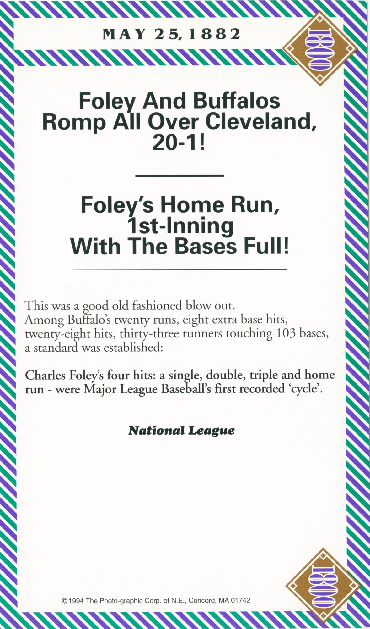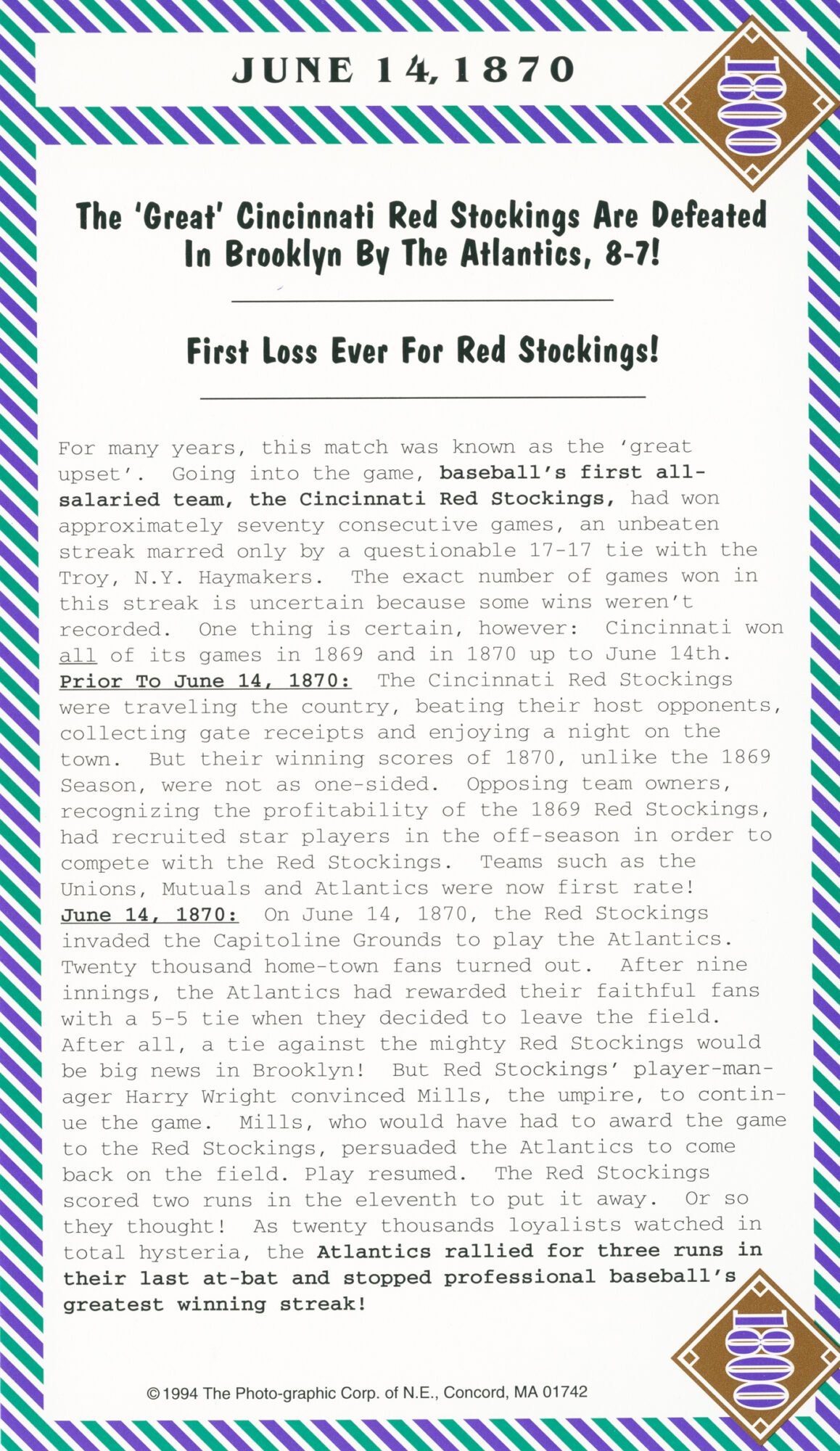The 1800s: We have been baseball fans for over 60 years, and like many of you we have played, watched, read, researched, listened, and discussed … a mind-boggling amount of baseball. So, we think we can say without reservation that there is no better view of the beginning of baseball history than these thirty-six Box Score Cards. These box score game cards represent the foundation of baseball history. They take you on a journey from it's primitive beginning (1845) on a lazy fall day when someone, no one knows who, decided to keep the box score of a game to the end of the 19th Century when baseball was a way of life for most Americans.