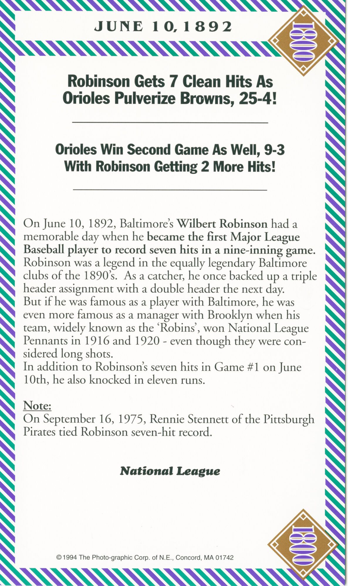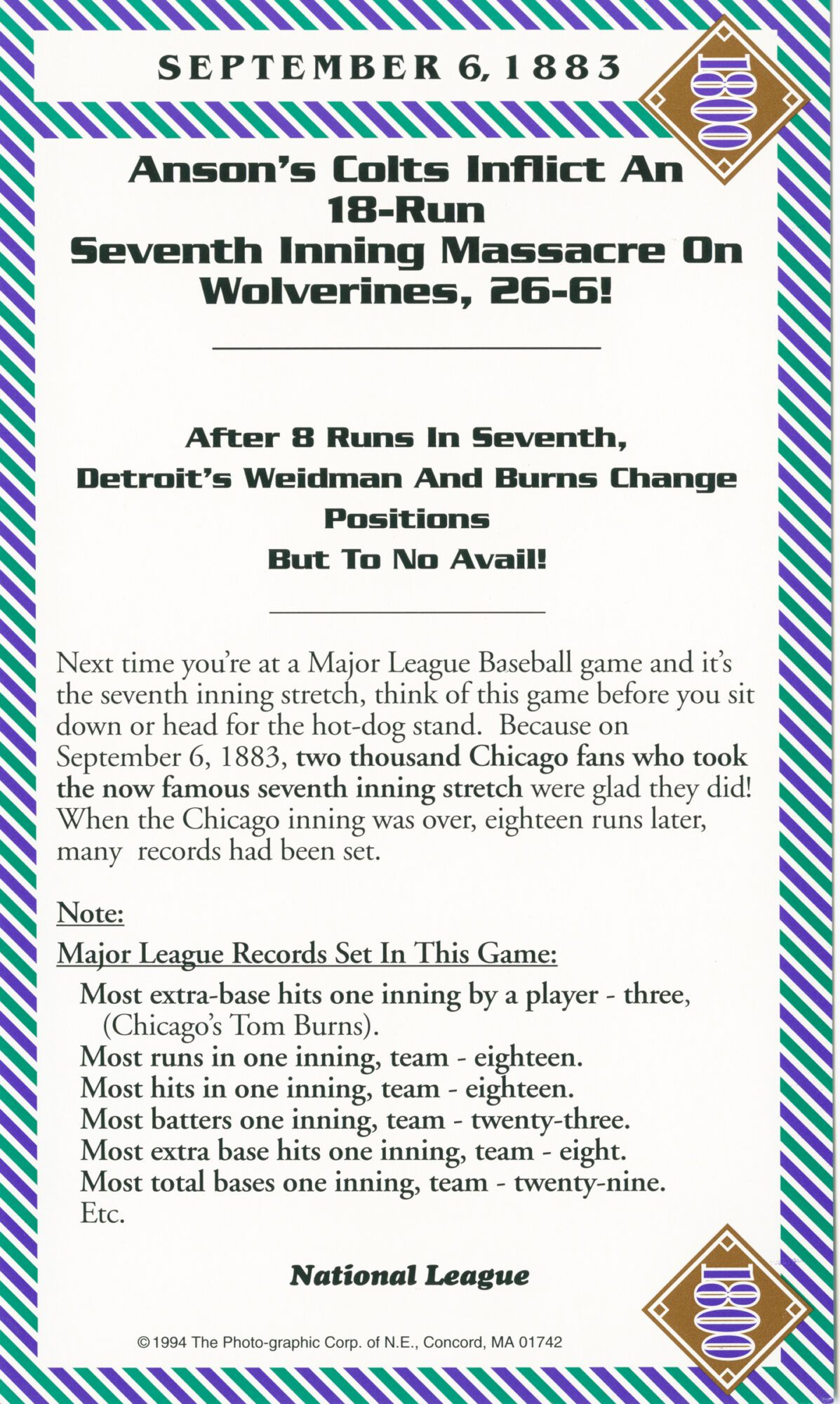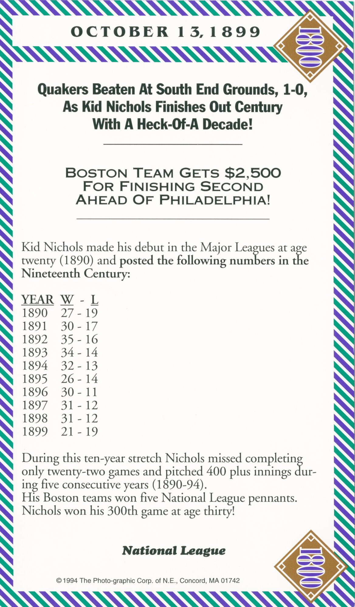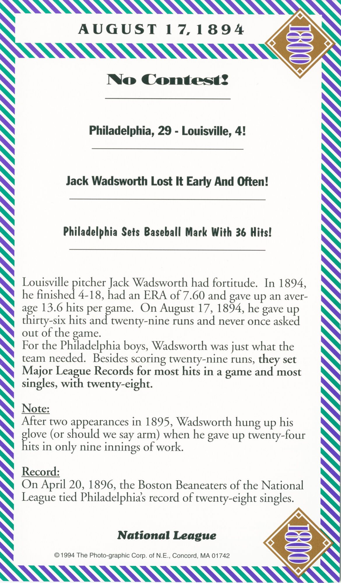 The incomparable 1800 games included:1845, 1858, 1870, 1871, 1876 (5), 1880, 1881, 1882 (3), 1883 (4), 1884 (3), 1885, 1886 (2), 1887, 1890, 1892 (3), 1894(2), 1896, 1897 (2), 1898, and 1899.