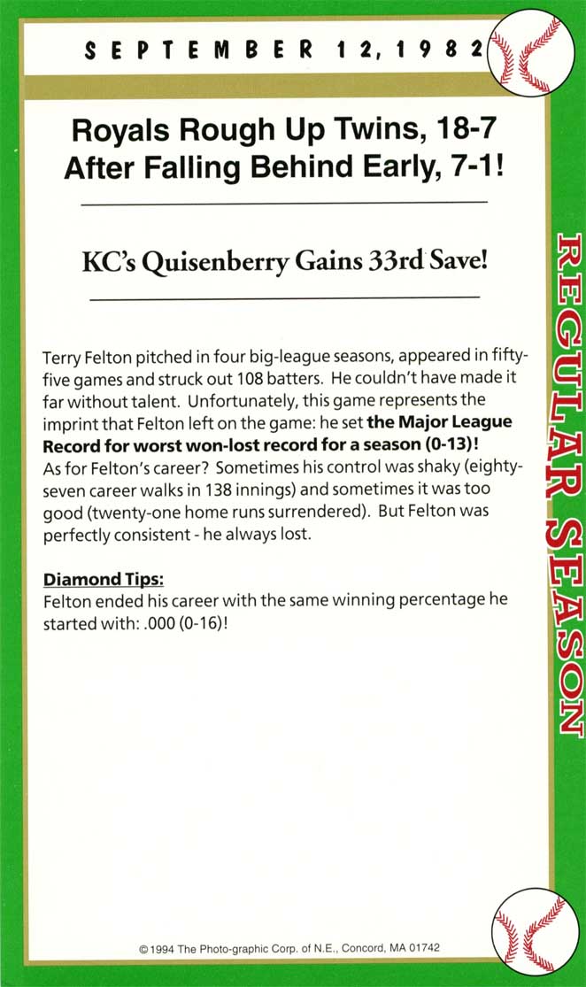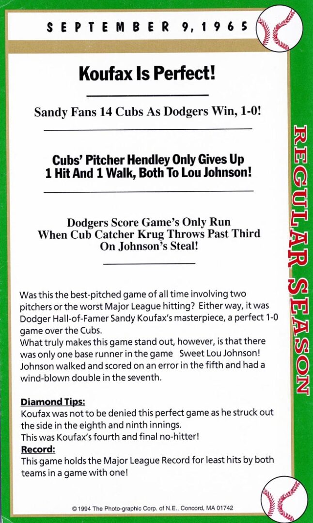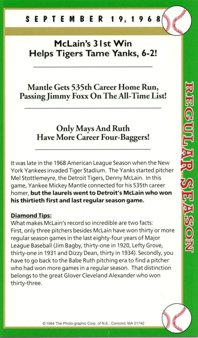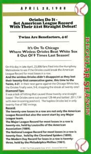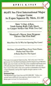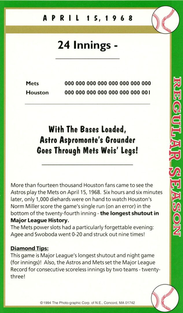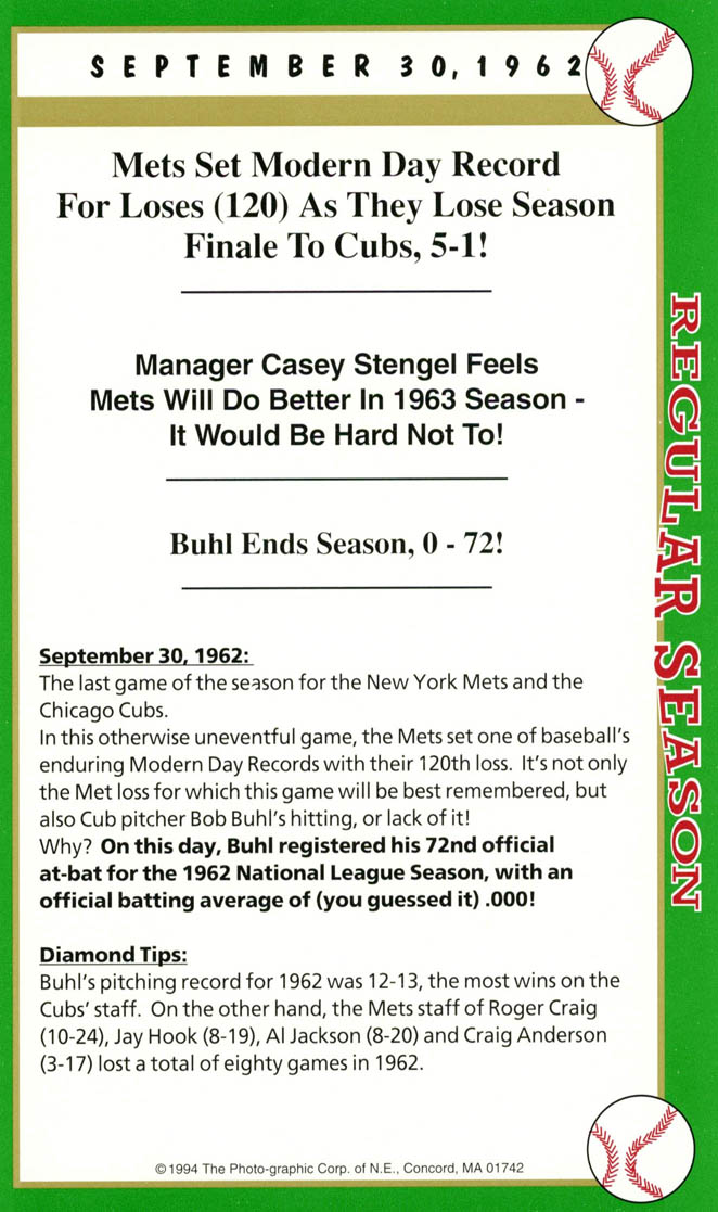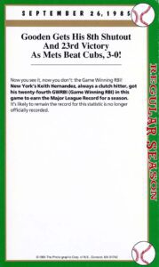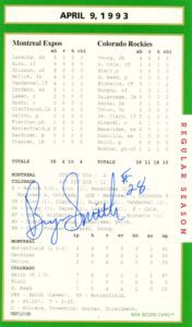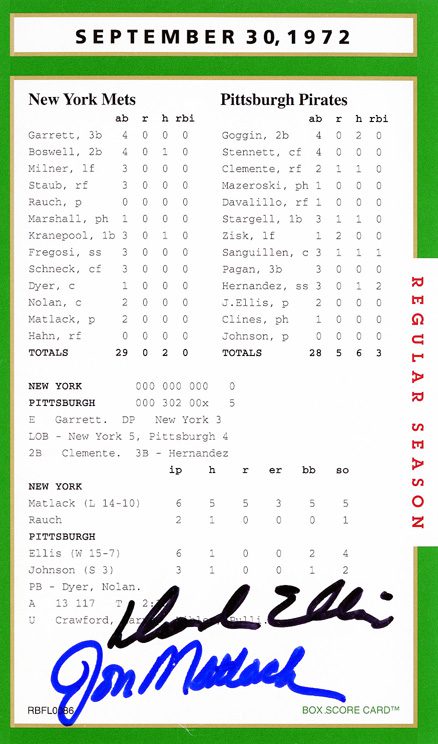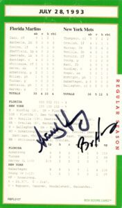 After twenty-seven consecutive loses easily the MLB record Mets’ pitcher Anthony Young finally won a game. And it was the biggest news story in New York City that day hands down. And to give the box score game card more value Florida Marlin Bryan Harvey the losing pitcher to Young signed the card as well.