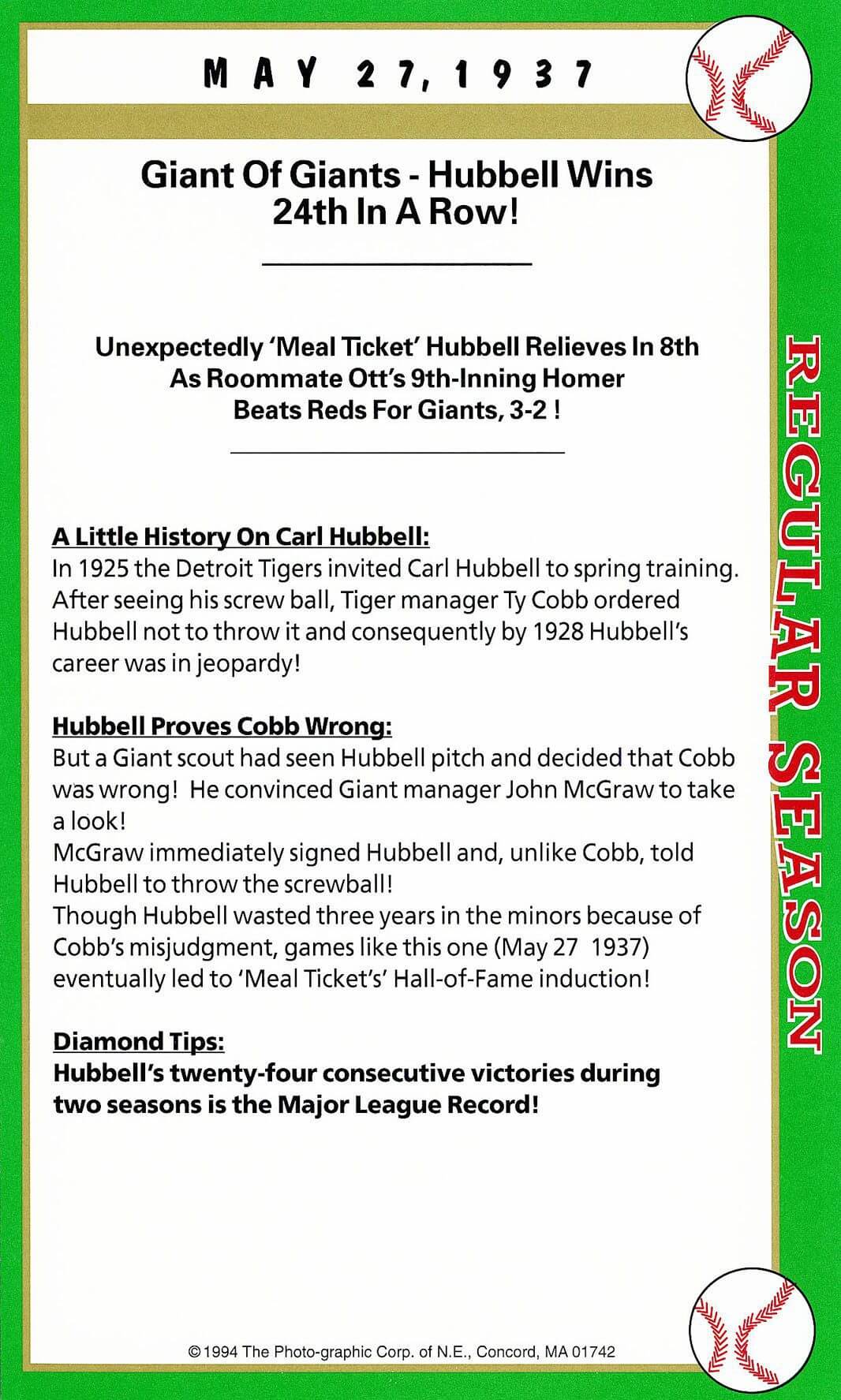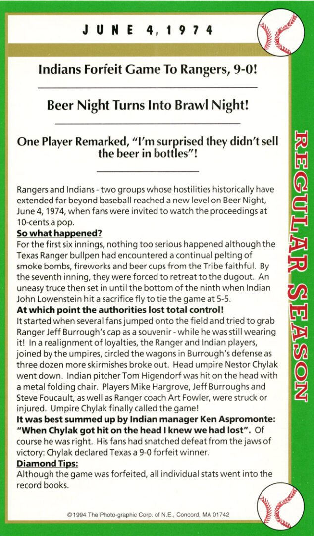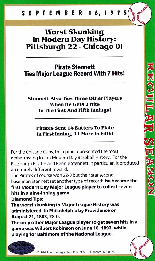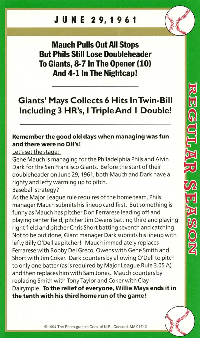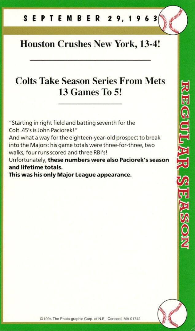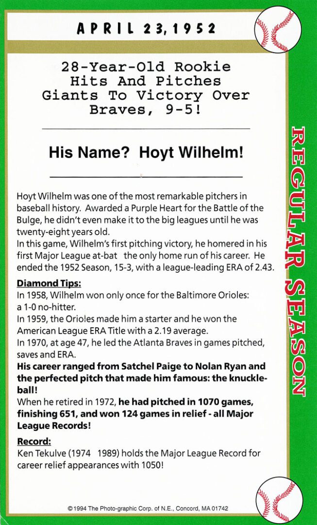 After twenty-seven consecutive loses easily the MLB record Mets’ pitcher Anthony Young finally won a game. And it was the biggest news story in New York City that day hands down. And to give the box score game card more value Florida Marlin Bryan Harvey the losing pitcher to Young signed the card as well.