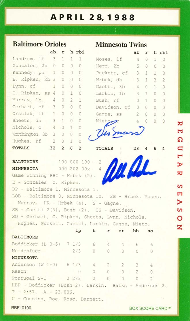 What autograph would represent the O’s history 21st straight lost to open the season than the pitcher that beat them, Allan Anderson. And for good measure, Moses … ah he had two RBIs.