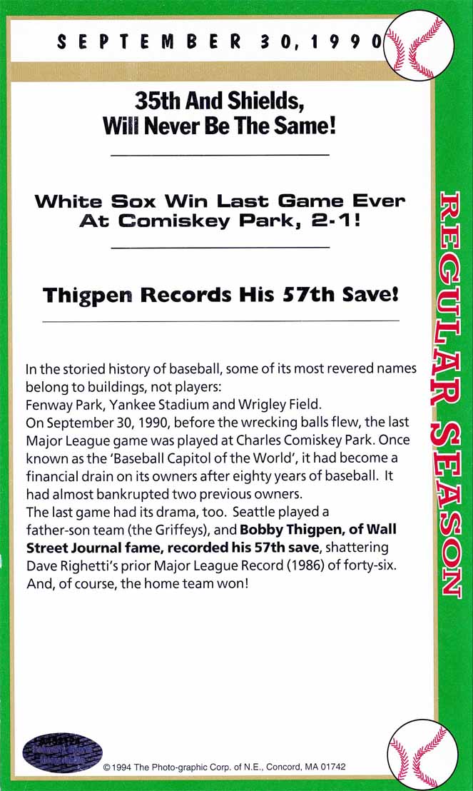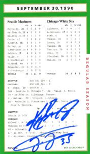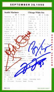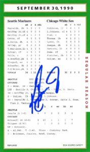 This was the last game played at Comiskey Park. Not only was Comiskey the person a pillar in the growth of MLB early twentieth century but the players who played and signed this box score game card that make it so extraordinary. First, you have Ken Griffey Jr playing alongside his dad Ken Griffey Sr. the only father-son ever to play in the same game together. Secondly, Jack McDowell threw the first pitch that day and ended up the last winning pitcher in Comisky Park history. Then, Bobby Thigpen recorded his 57 save of the season shattering at the time the MLB record while throwing the last pitch in Comisky park history. While HOF Frank Thomas had one of the two Sox RBIs. Lastly, a little-known rookie named Sammy Sosa appeared in right field for the Sox not the Cubs.