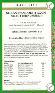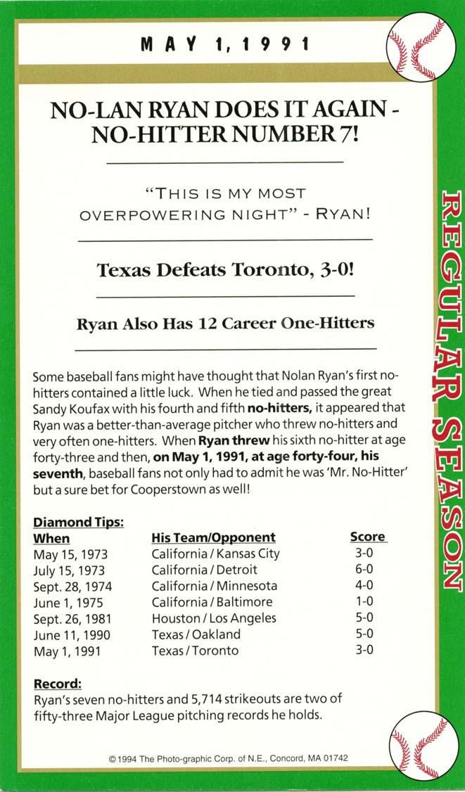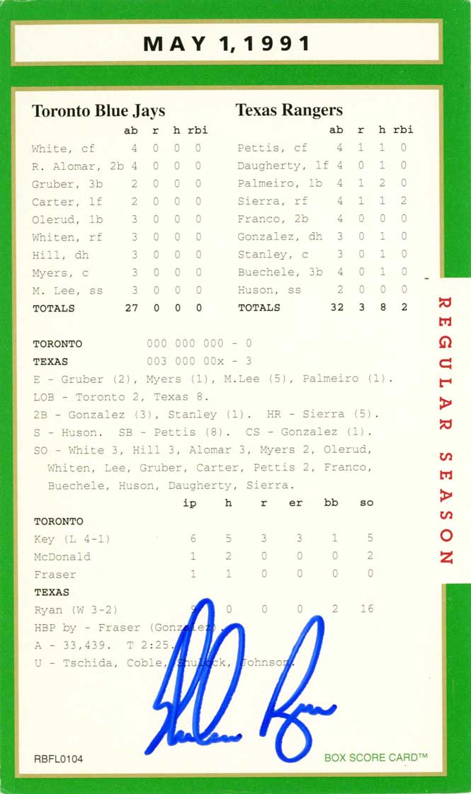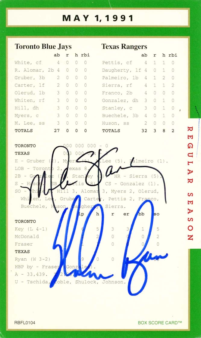 Nolan Ryan is simply the greatest strikeout / no-hit pitcher in all of professional baseball history … it’s that simple. His signature is on this his seventh and last no-hitter, is vintage And we also got Ryan and his catcher Mike Stanley to signed a box score game card as well. Perfect, though it seems incomprehensible that Ryan never did pitch a perfect game.