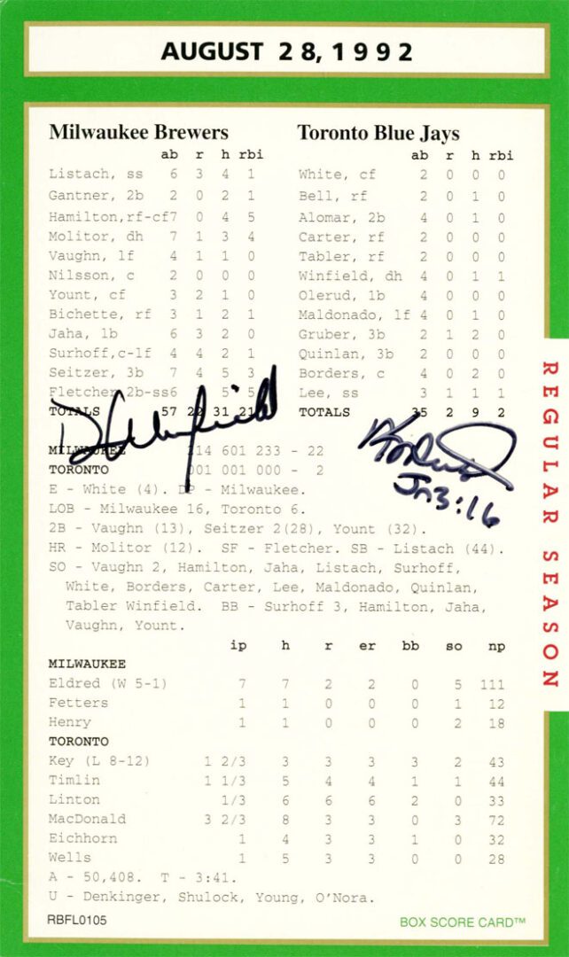 Note: Thought it would be cool to get Dave Winfield to sign the game card as well since he played in the historic game.