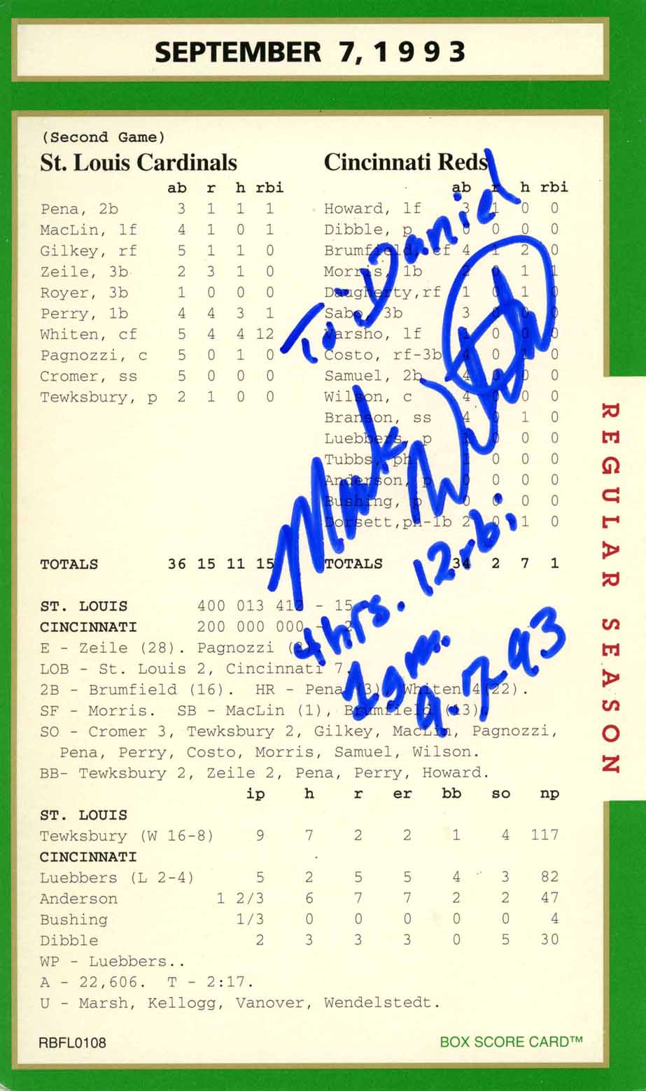 Note: Getting Whiten to sign the game card was no small task but finally I succeeded. The last Regular Season Series game card and a gem.