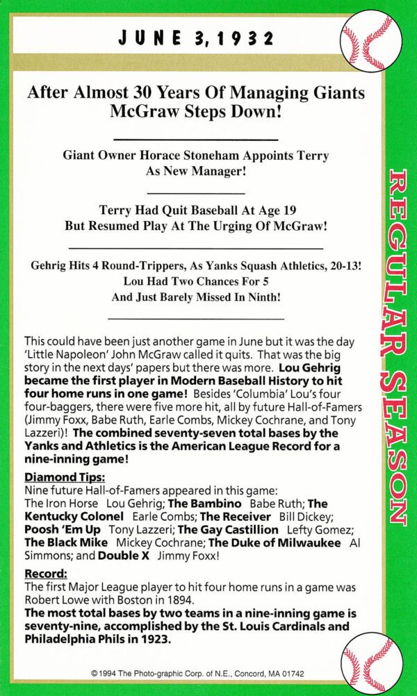 The collection: Below are 61 box score game cards from the Regular Season collection. They (signatures) represent a player(s) who played a significant role in that regular season game. The signatures range from a 1932 box score game card when Lou Gehrig became the first player in the baseball’s modern era to hit four home runs in a game and ending with the 1992 game card when Mark Whiten set the record for most RBIs in a game (12). And a load of historic signatures in between.