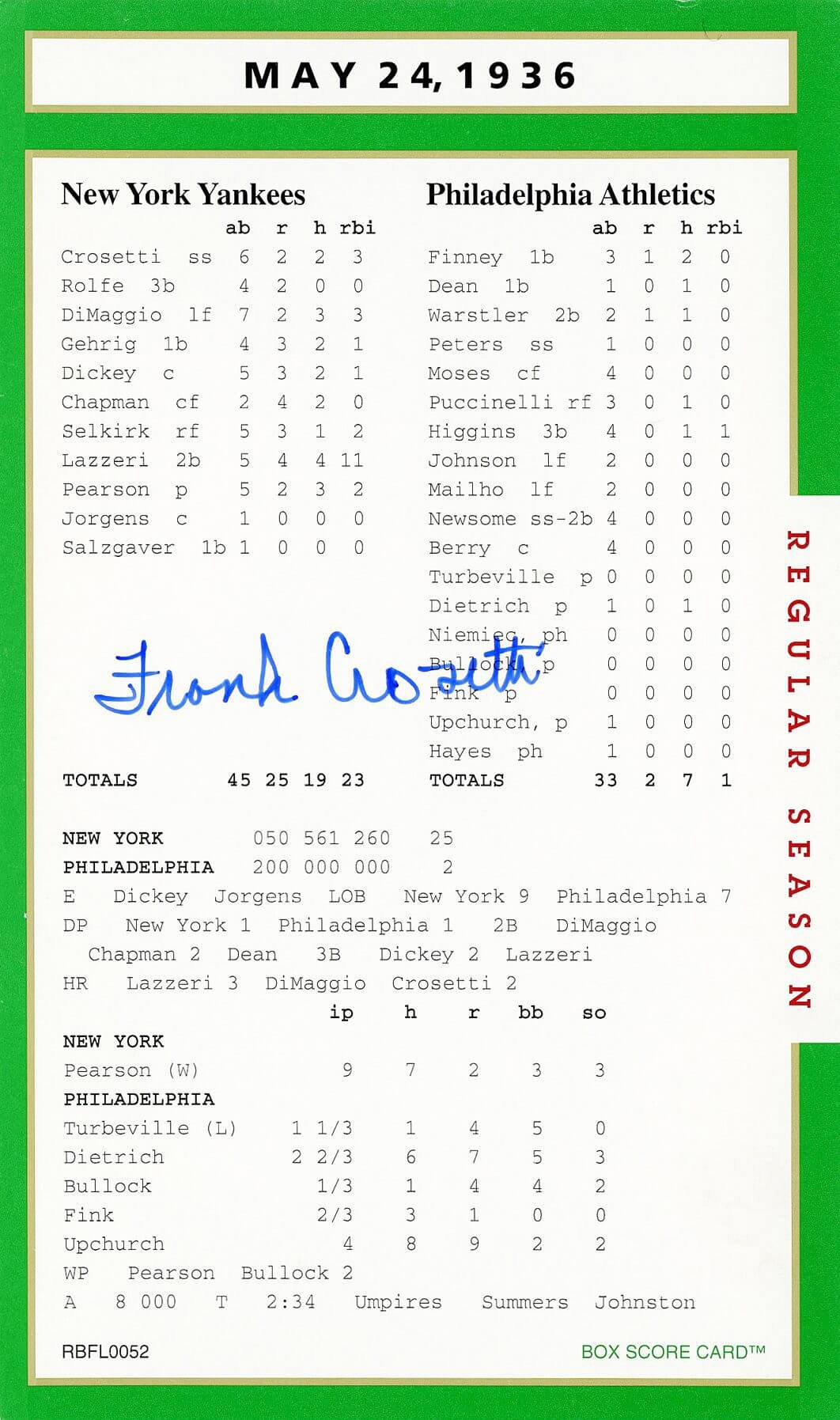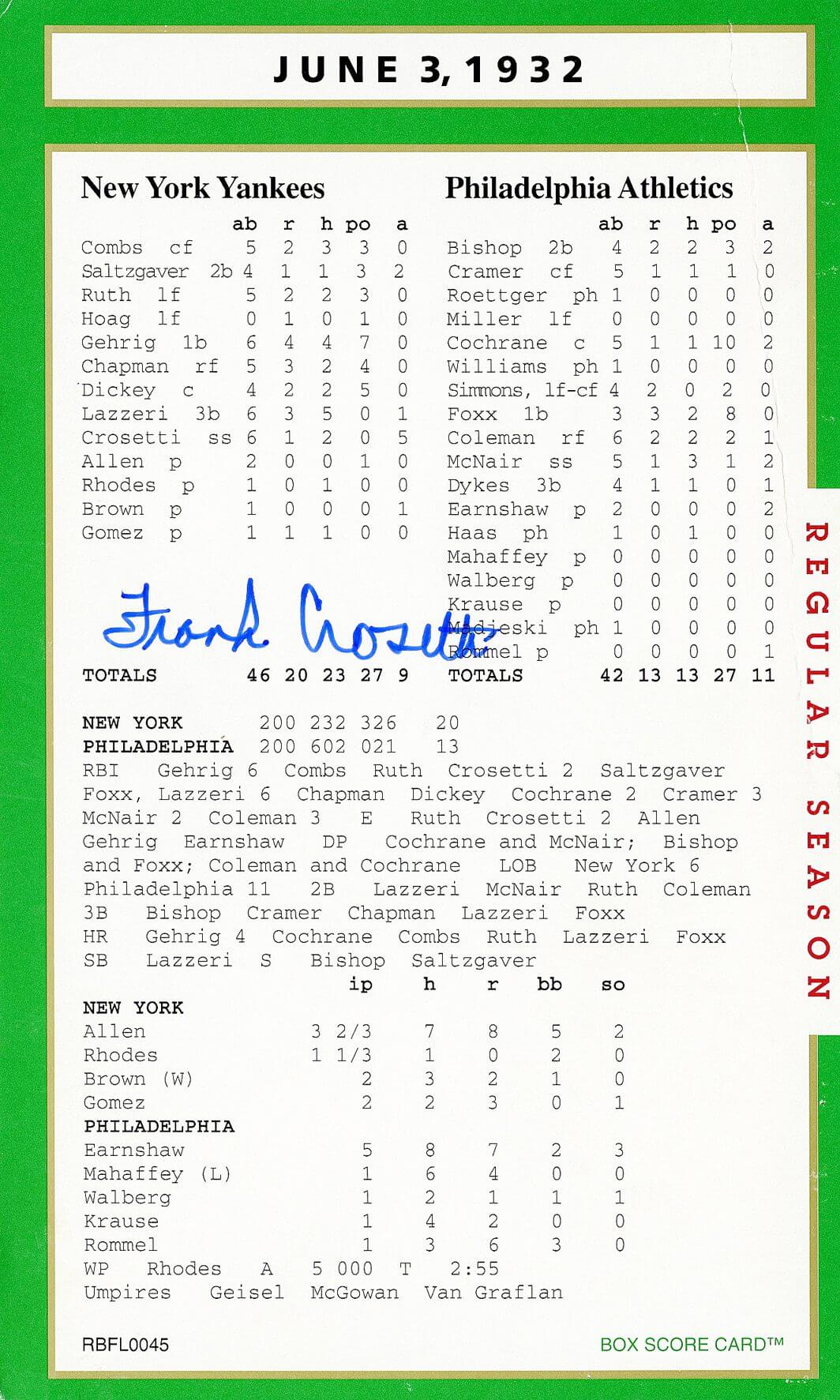Autograph(s): Frank Crosetti (D)