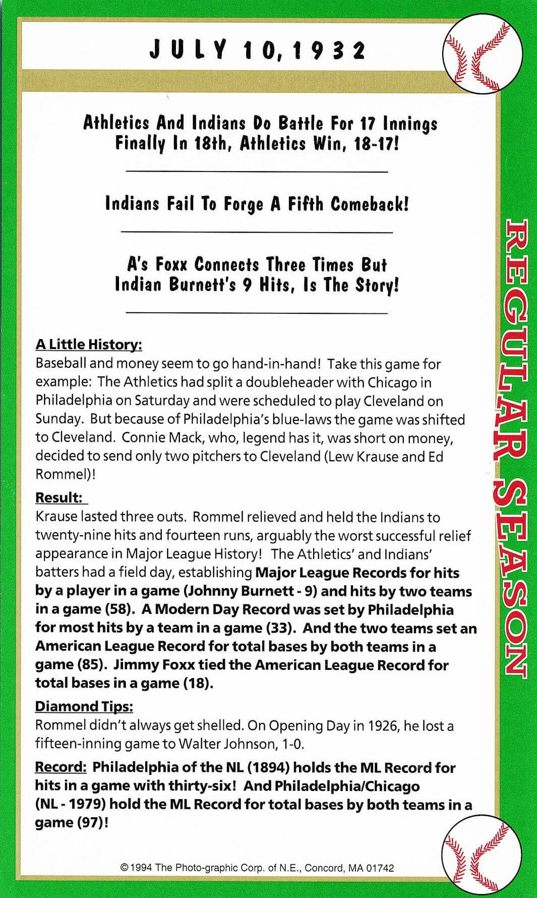 This is considered one of MLB baseball’s greatest statistical game with over 100 records set on that day of which a number (records) have survived time including a winning relief performance by Eddie Rommel of 17 innings, 29 hits, 14 runs and 9 walks.