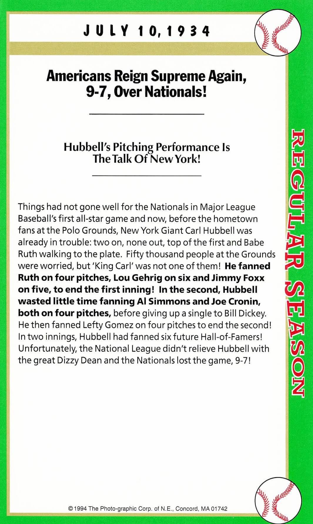 Harder was no one-day all-star wonder. He would pitch three shutout innings in the 1936 All-Star game as well and follow it up with three more shutout innings in the 1937 game for eleven consecutive shutout all-star innings. And, he had a marvelous career with many outstanding seasons posting 223 career wins.