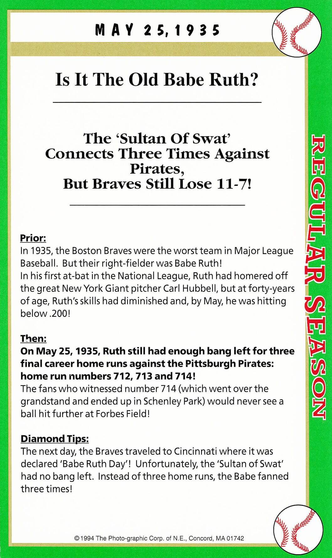 Note: The Babe played again the next day fanning three times but as most fans agreed in that blessed era, it was at times more exciting watching the Babe strike out than hitting a four-bagger. Babe retired four days later 5-30-1935.