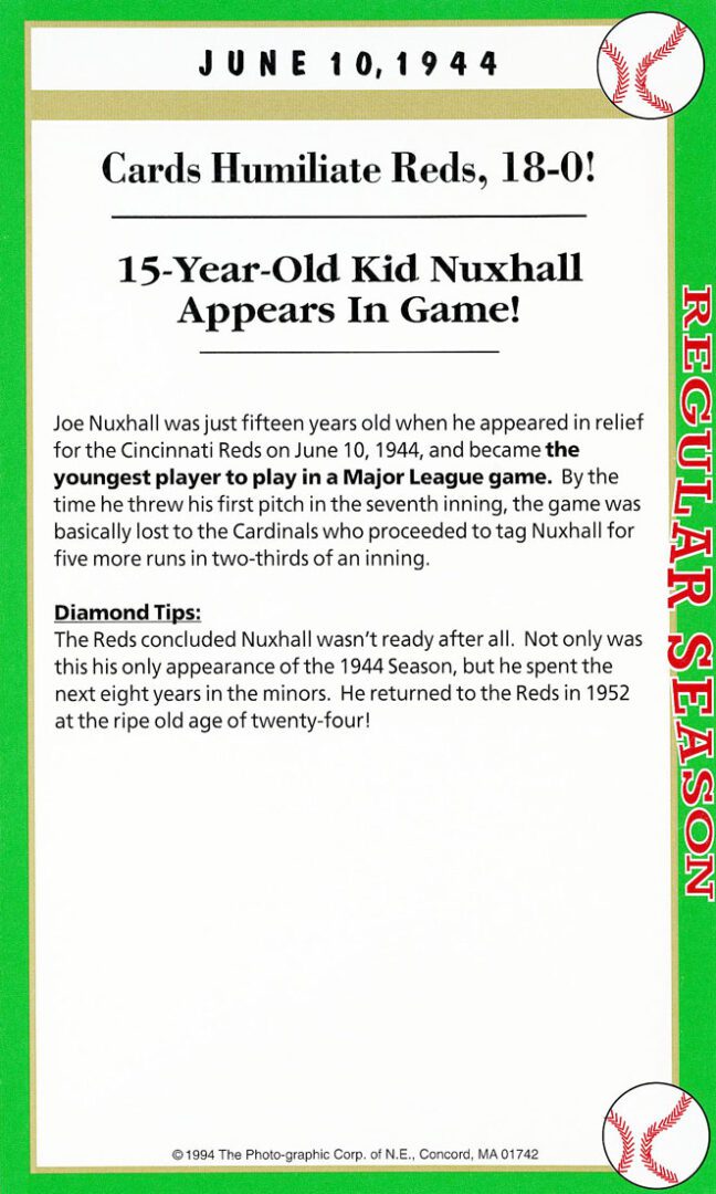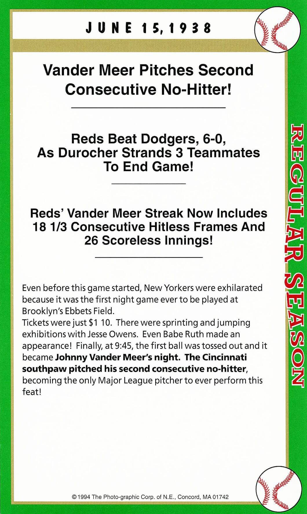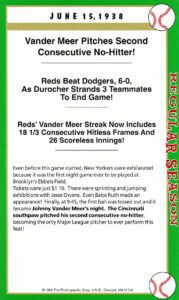 Tot Pressnell had a brief pitching career (32-30) that included pitching in relief in this historic game, Johnny Vander Meer’s second consecutive no-hitter. As for Pete Coscarart, he played shortstop that day, his primary position for eight MLB seasons. Note: This was the very first night game ever played at famed Ebbets Field …. quite an historic game.