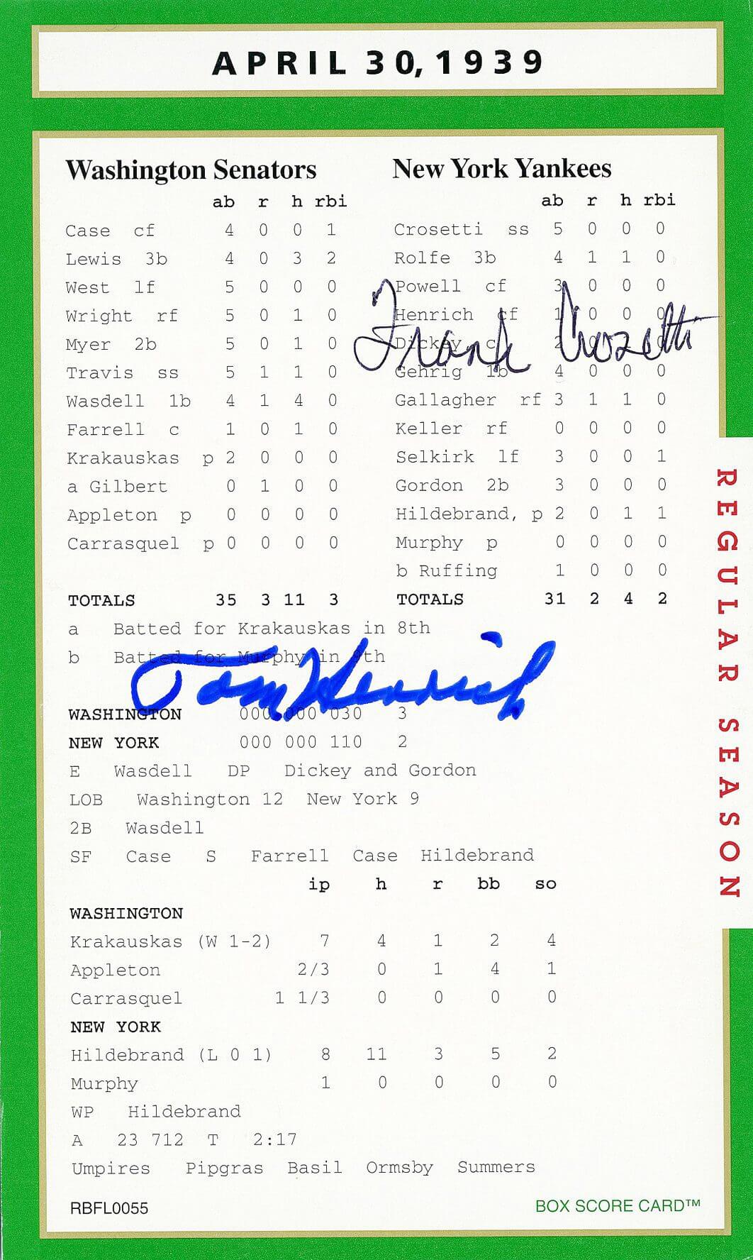 Autograph(s): Phil Rizzuto (D) – HOF; Tommy Henrick (D).