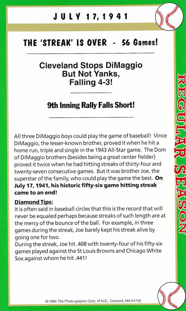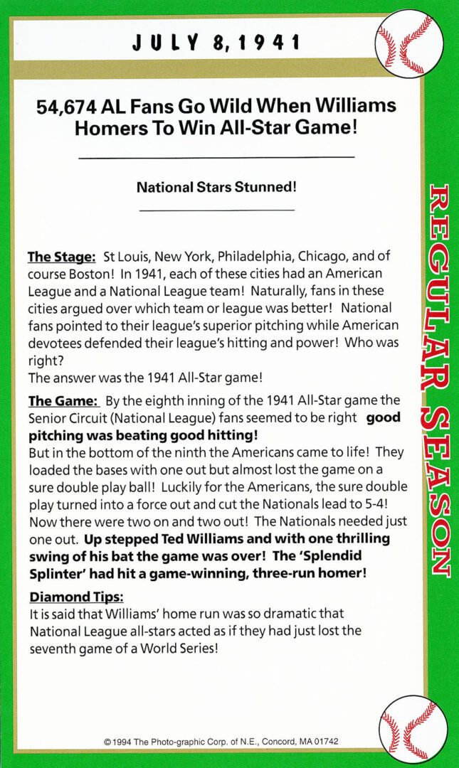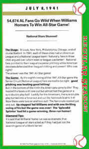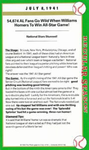 Note: When inquired about this homerun years later, Williams said it definitely was one of my greatest thrills. And this year 1941, would also mark Williams’ season ending .406 batting average … the last .400 hitter in MLB history.