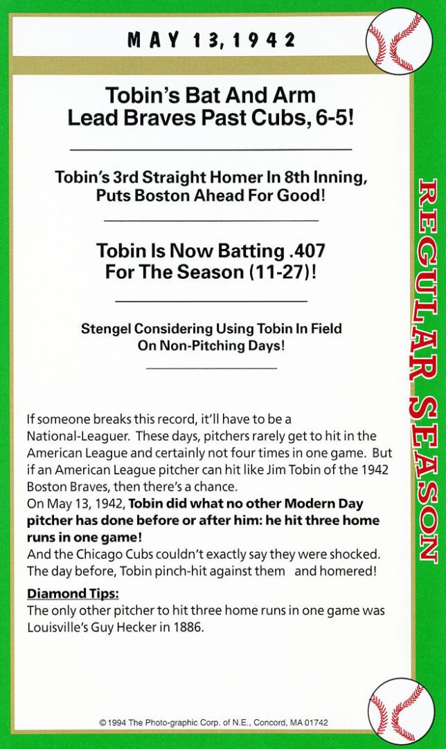 Tommy Holmes had quite a major league career, at one point holding the NL record for consecutive game hitting streak at 37 and was a lifetime .302 batting average.