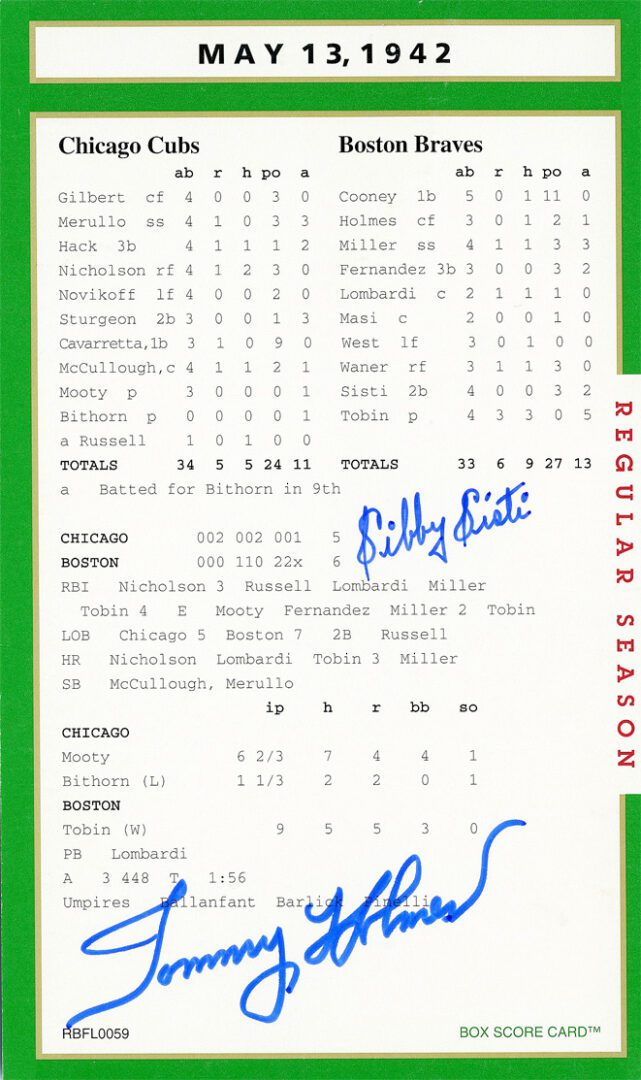 Autograph(s): Sibby Sisti (D); Tommy Holmes (D).