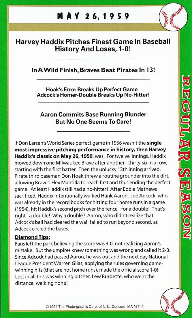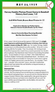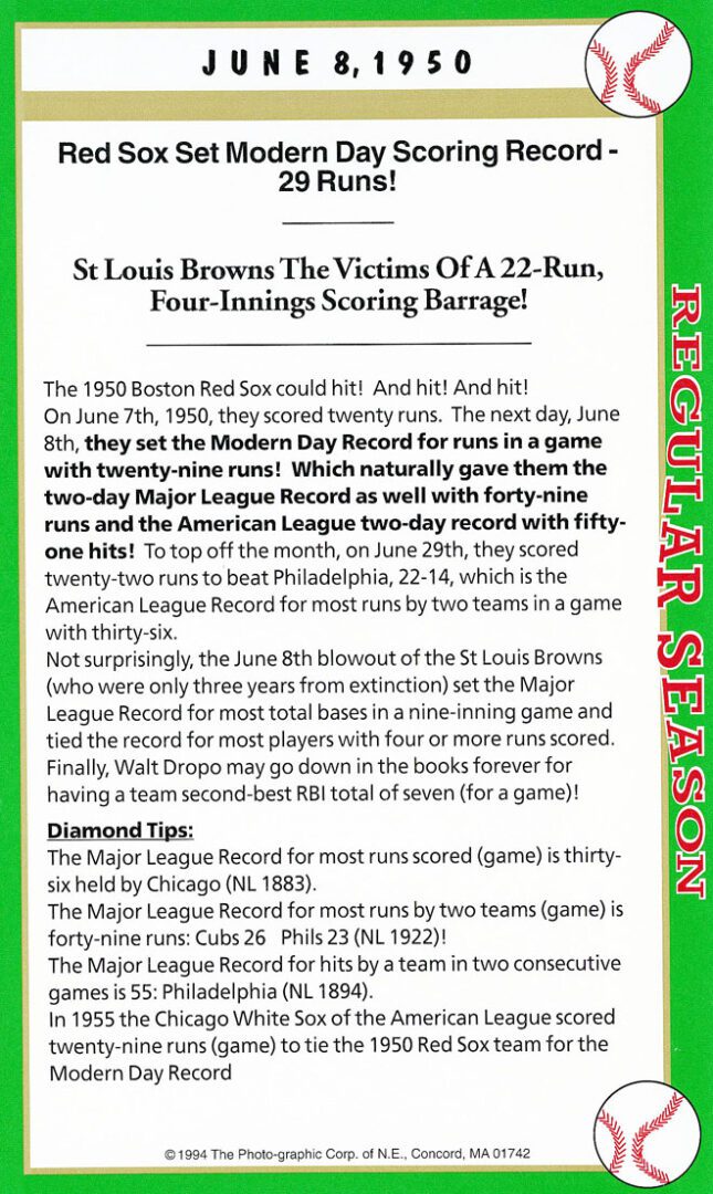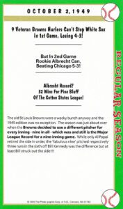 Note: For the 1930 games I was limited to players who were still alive, limited to internet technology at the time finding a player and the main criteria that the player had to have played in the notable game made it that much more difficult and expensive. For example, when I contacted Frank Crosetti years and years ago, he had appeared in three of the historic box score games. So, naturally I had him sign all three historic game cards (# 45, 52 & 55). But that was a rare example. In any case, eventually in my search I found many of the players I was looking for that fit the criteria> Players like Bob Feller card # 56, Ted Williams card # 57, Warren Spahn # 62.. you name it, I found them .