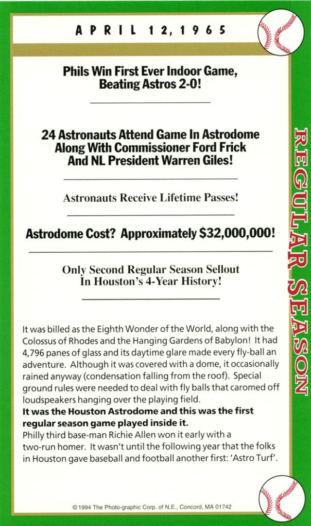 This box score game card speaks for itself one of the few MLB records that may never be broken but why it is so special? Because HOF of Phil Rizutto’s autograph on it. Rizutto was a critical player on a Yankee dynasty that captured ten AL titles and seven World Championships in his 13 seasons, and although Rizzuto holds numerous World Series records for shortstops he is just as well remembered for his forty years of broadcasting Yankee games with his trademark expression ‘Holly Cow’! Yes, Holly COW!