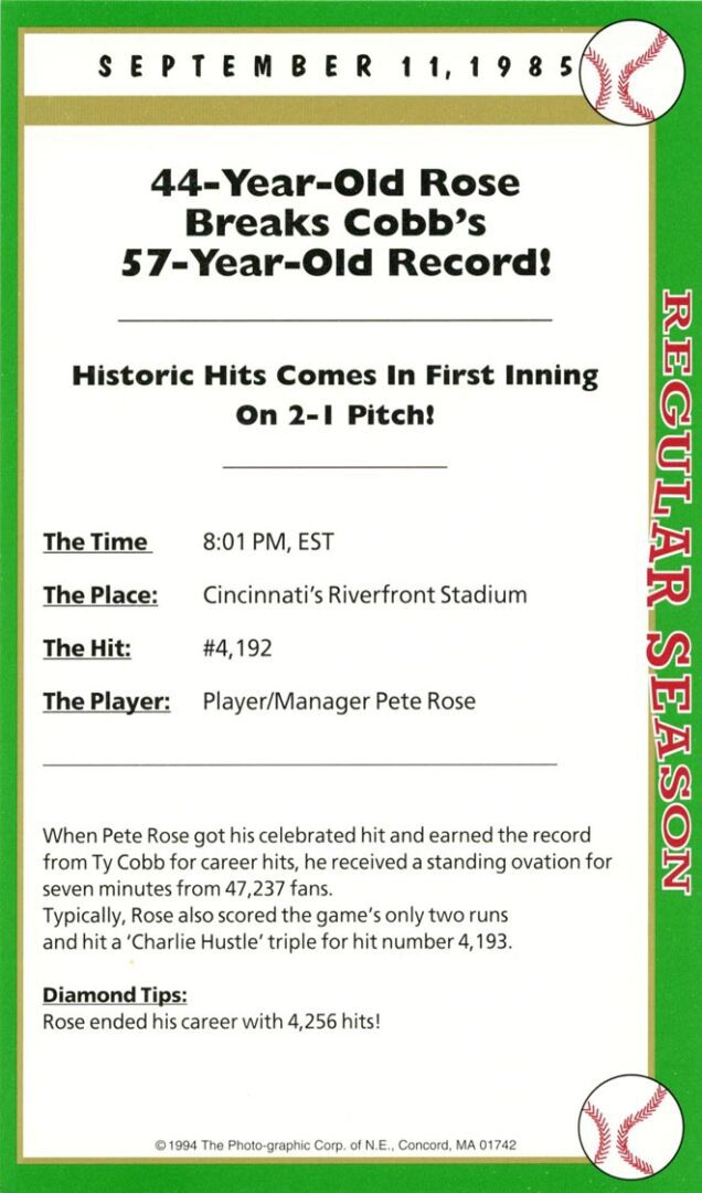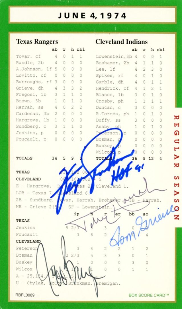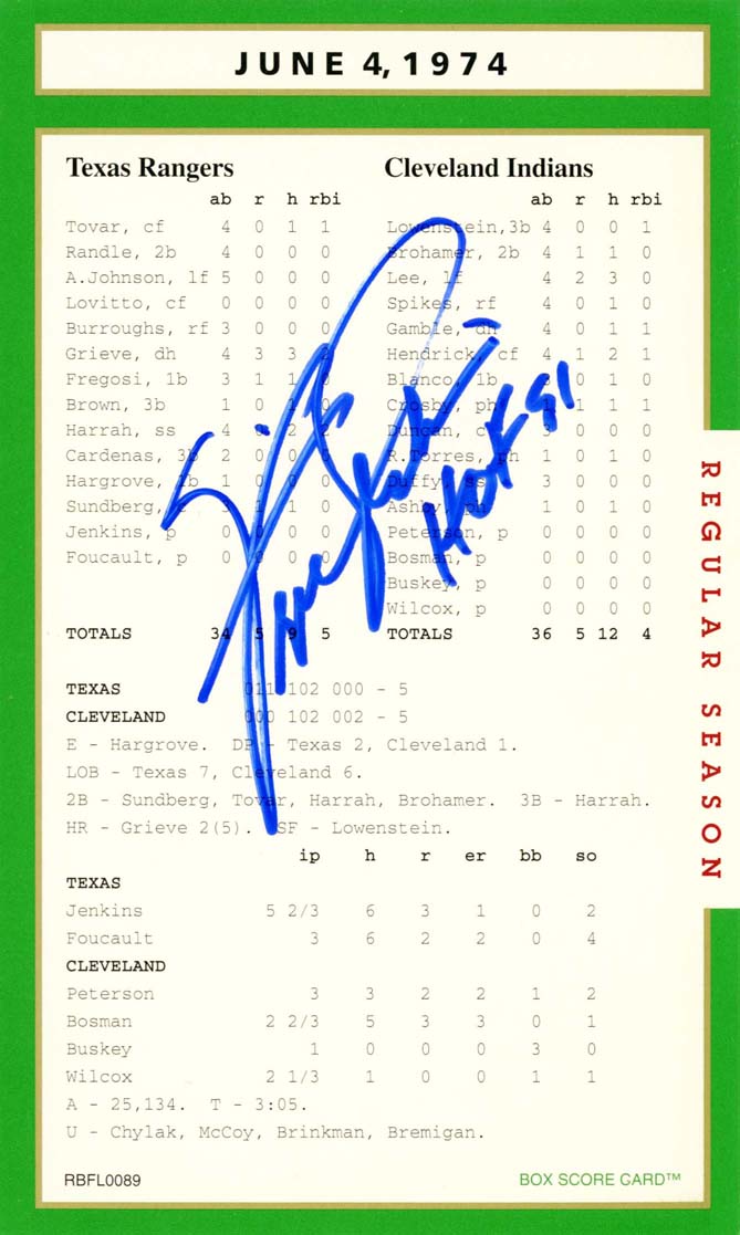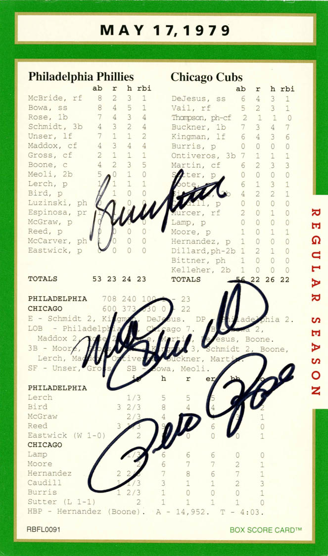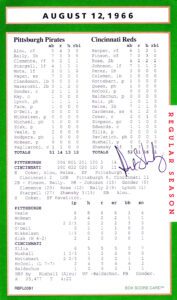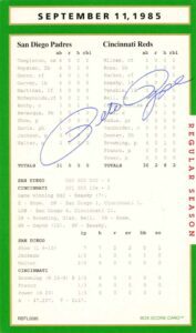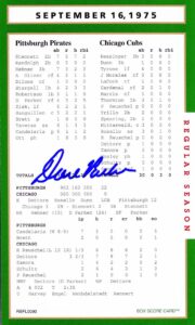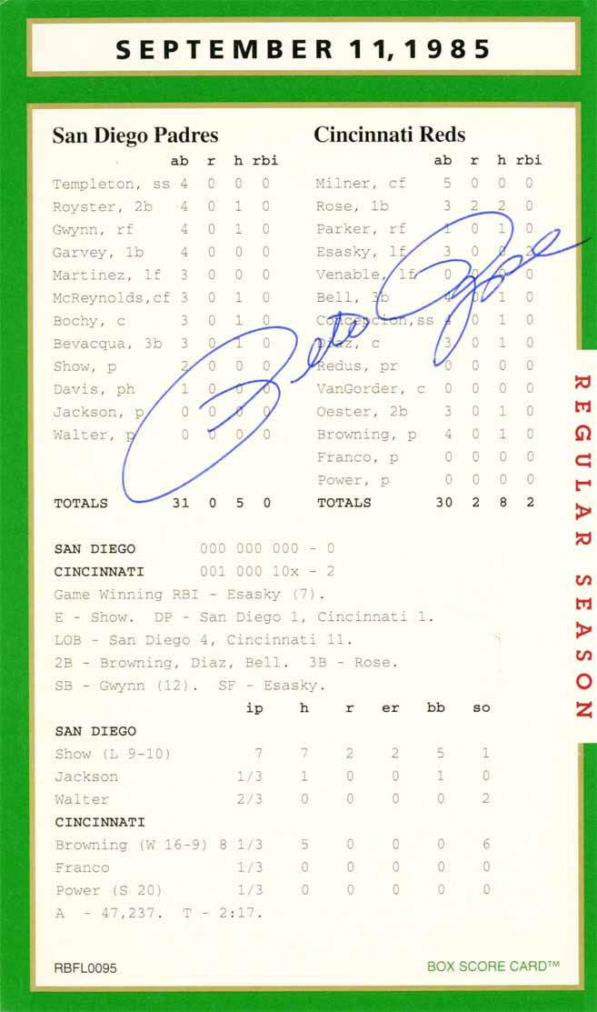 What can be said about Pete Rose that hasn’t already been said or better yet what he hadn’t said! Regardless, he was a heck of a ball player and his signature on the box score game card is certainly historical. His autograph was never had to get. For free? A friend of mine ran into him in the airport and asked him for his autograph. Rose replied, “Got 40 bucks!” Pete to a tee!