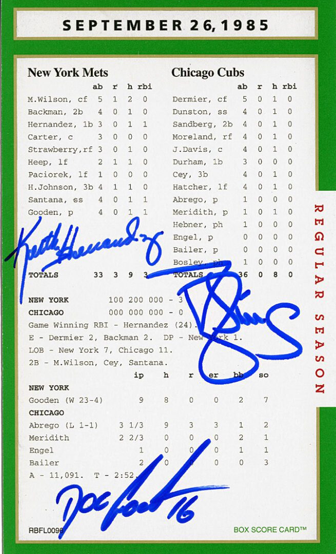 Interesting game because Keith Hernandez set the MLB record for GWRBI’s, (Game Winning RBI) and the next season MLB stopped keeping the stat. Some people content that this stat was costing owner’s money during contract negotiations. In addition to Hernandez’s autograph is Dwight Gooden and Darryl Strawberry’s. Gooden would win the Cy Young year (1985) and Gooden (1984) and Strawberry (1983) were bot NL Rookie of the Year!