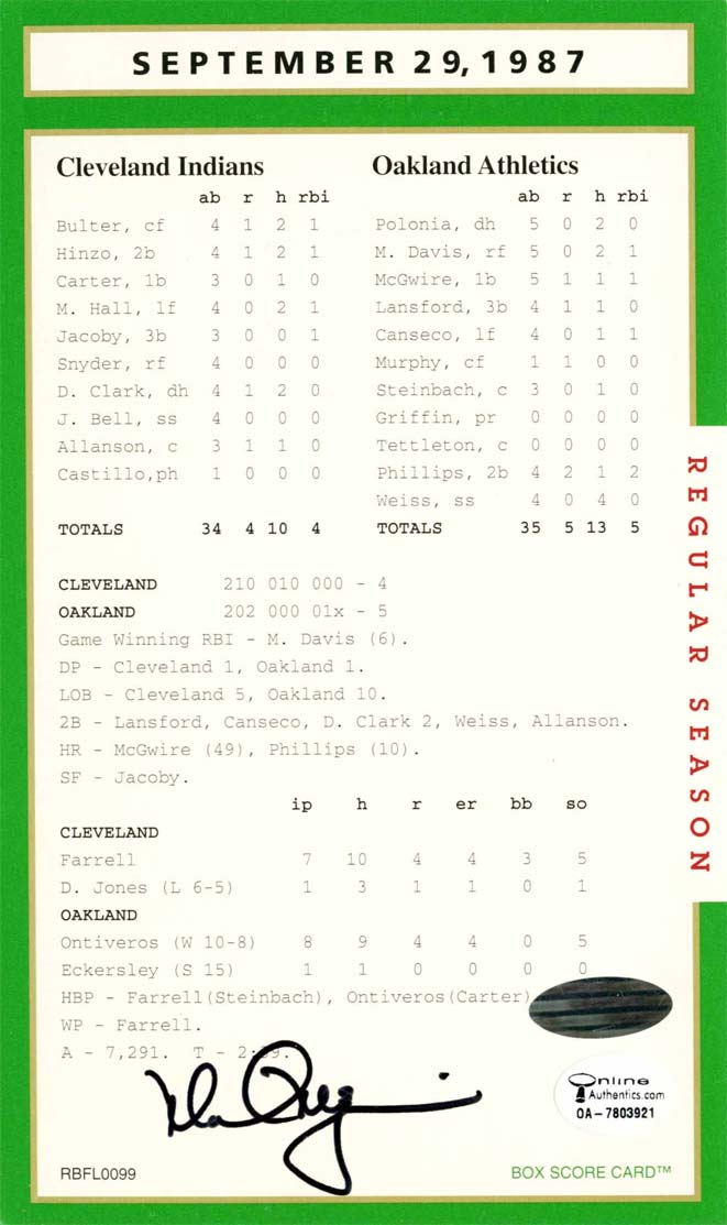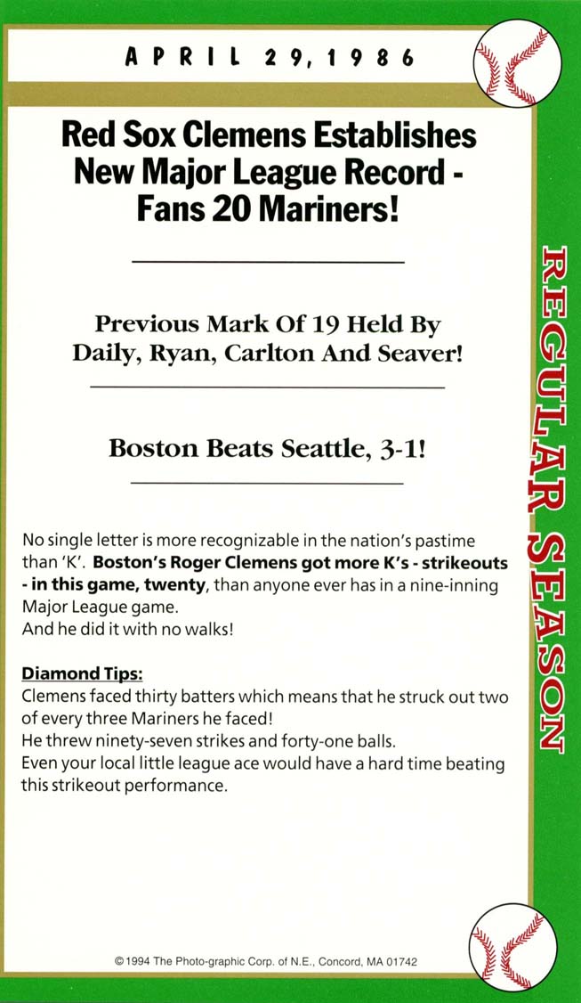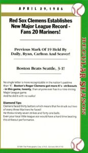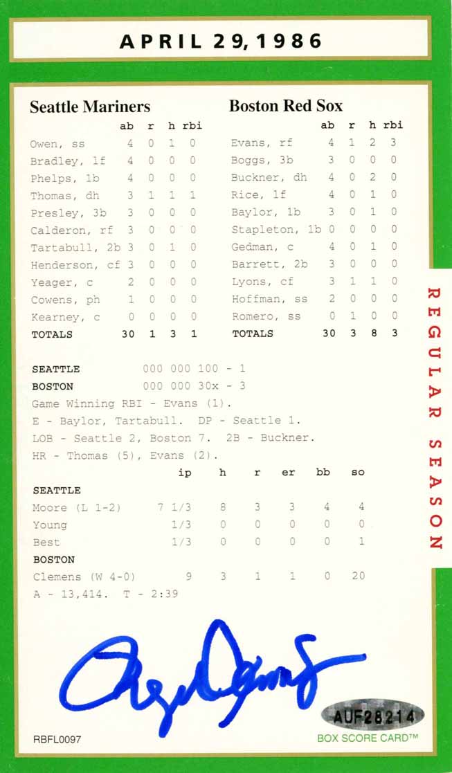 This was the real Roger Clemens, the MLB record of 20 Ks for a nine-inning game; gosh he was good. What happened after he left Boston who knows. Like Barry Bonds, he racked up a lot of stats and money but not votes for the HOFi Still Clemens autograph on this box score game card has a lot of value because it was before the accusations.