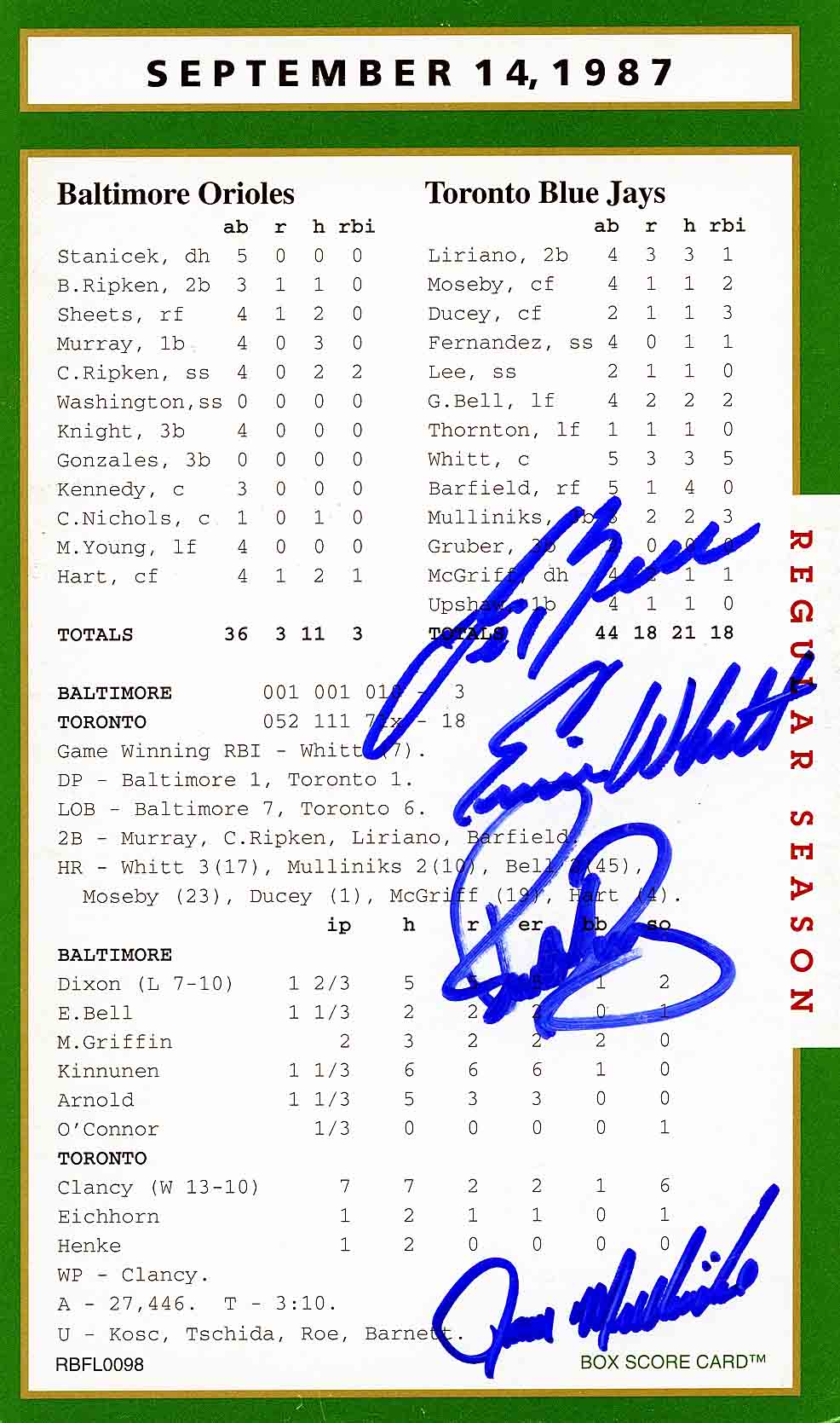 Autograph(s): Ernie Witt; Rance Mulliniks; Bob Ducey; George Bell.