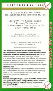 Over the years not much has changed in Toronto, the ball is still flying out. On this day, Toronto hit ten home runs in one game which is still the MLB record … six of them Ernie Whitt, Rance Mullinks and Rob Ducey. It’s hard to believe this record has stood for almost forty years.